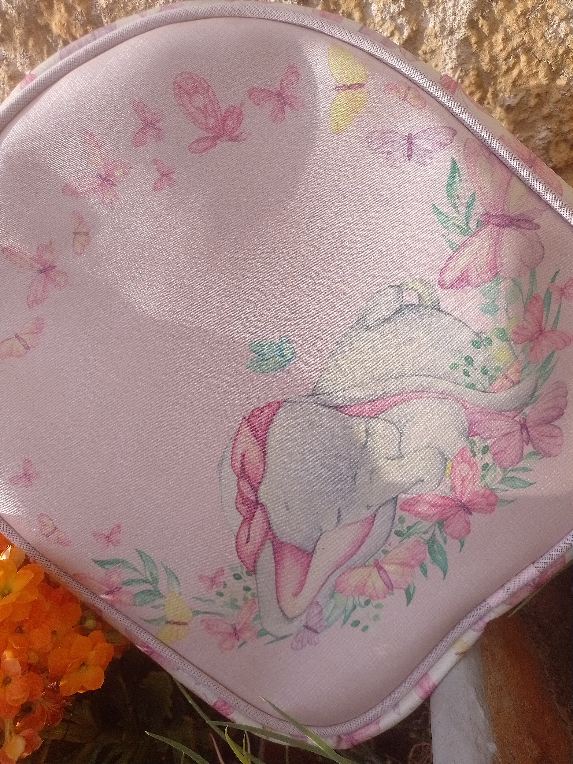 Feita emsintético rosa, com imagens de borboletas, o elefantinho está dormindo. Toda forrada, abertura com zíper, duas alças reguláveis e estruturada. Tamanho 25 cm de alturax 22 cm de comprimento e 10 cm de profundidade. Peça única e exclusiva aqui no Cristiane Carneiro Ateliê